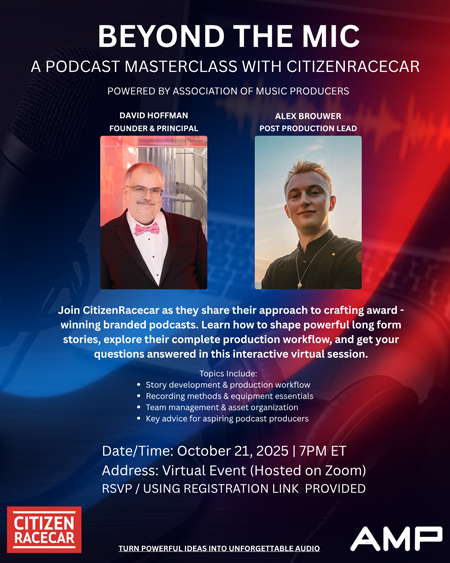 Join CitizenRacecar as they share their approach to crafting award-winning branded podcasts. Learn how to shape powerful long form stories, explore their complete production workflow, and get your questions answered in their interactive virtual session