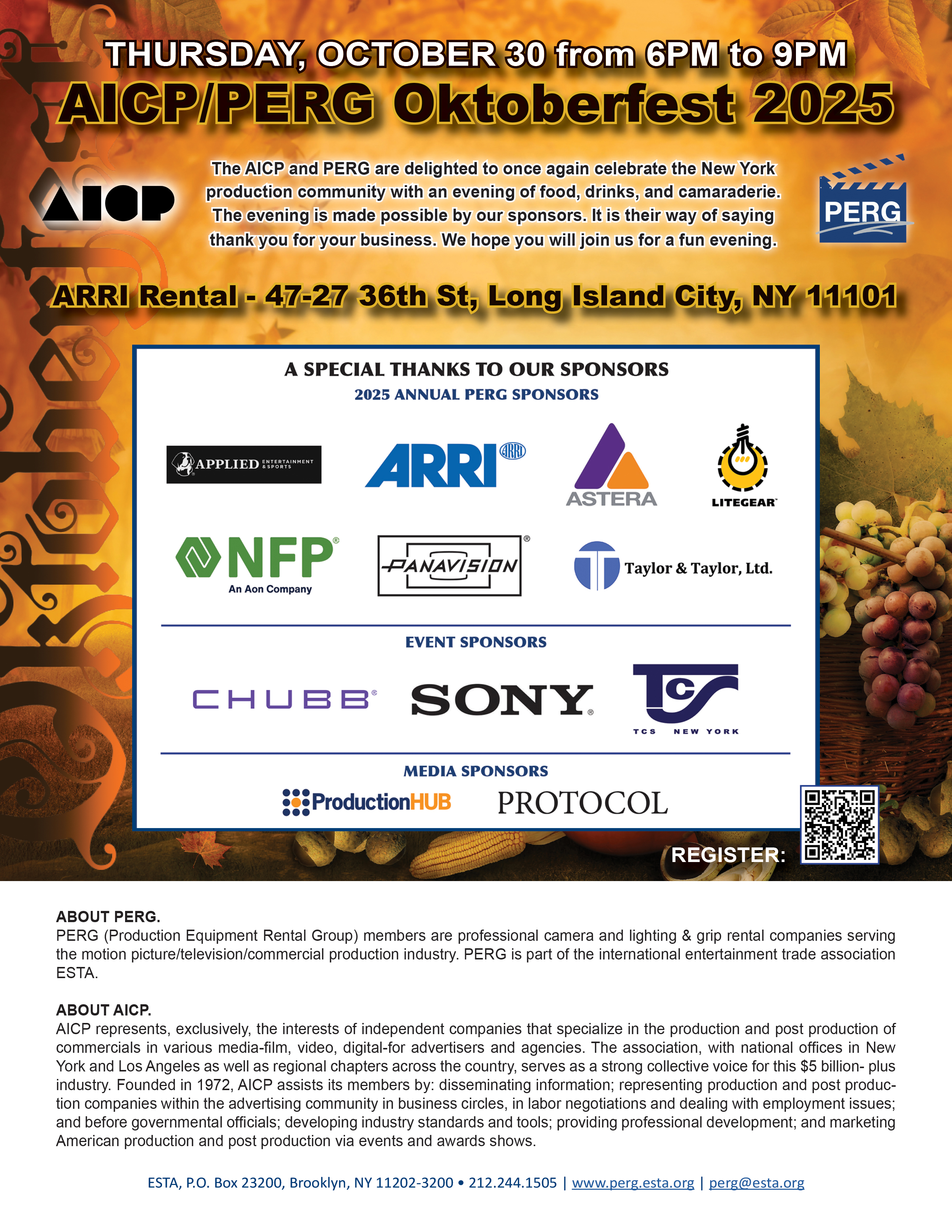 Join us on Thursday, October 30th at ARRI Rental in Long Island City for AICP & PERG's annual Oktoberfest celebration.